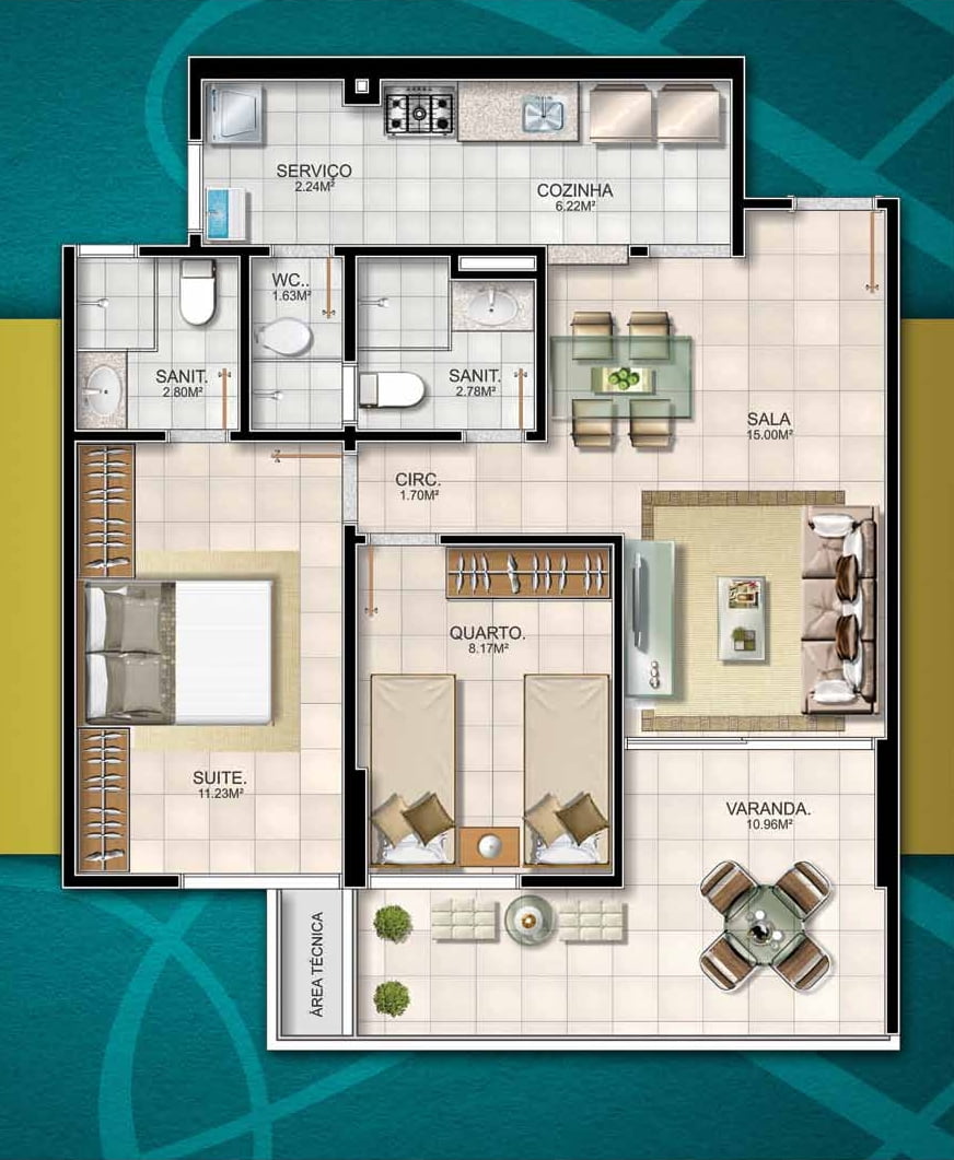 | 2 quartos | 2 | 1 | 1 | 71,67m² |