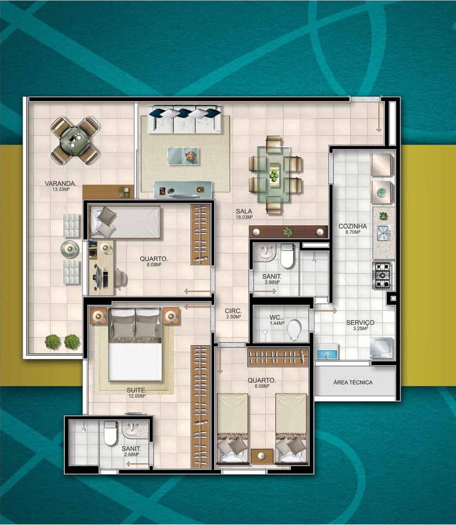 | 3 quartos | 3 | 1 | 2 | 91,61m² |