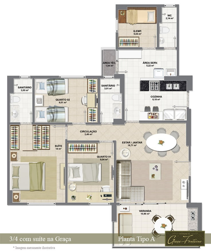 | Planta Tipo A – 3 quartos, sendo 1 suíte varanda gourmet e dependência completa | 3 | 1 | — | 105,00m² |