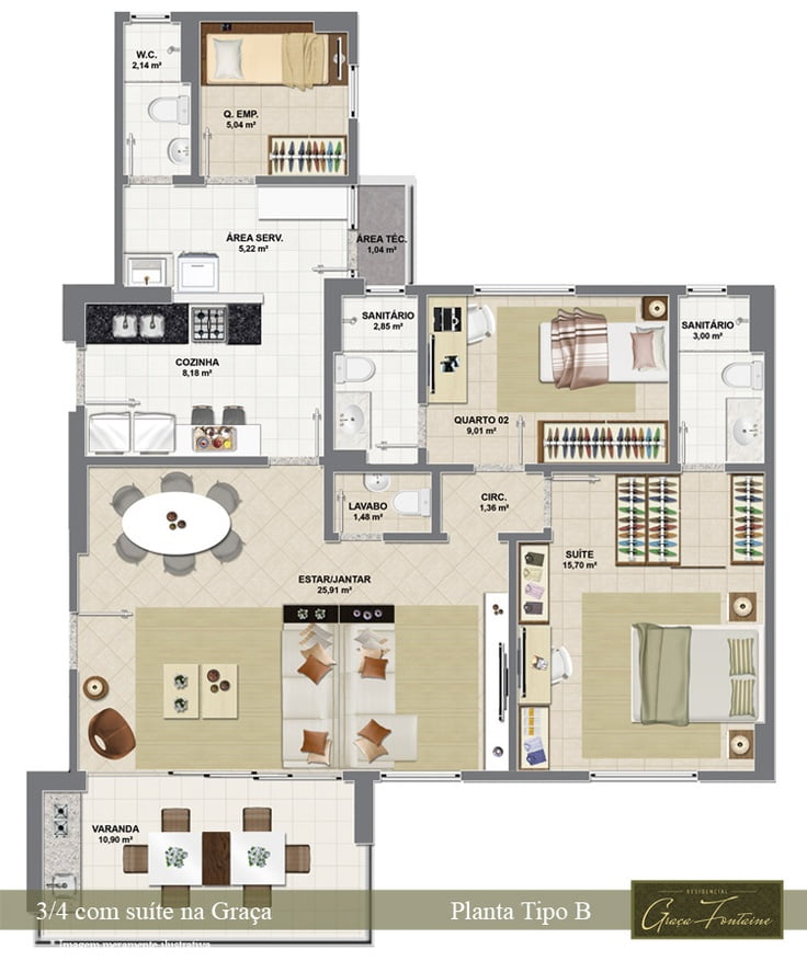 | Planta Tipo B – 3 quartos, sendo 2 suítes, lavabo, living ampliado, varanda gourmet e dependência completa. | 3 | 1 | — | 105,00m² |