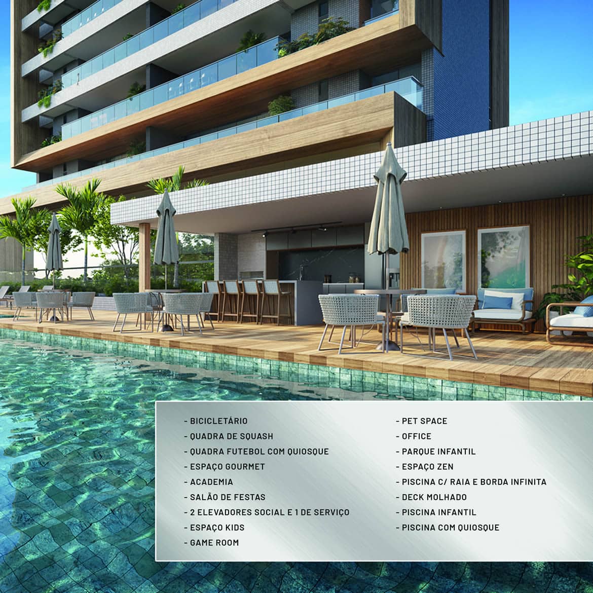 Relaxe à beira da piscina com raia e borda infinita, aproveite o deck molhado e desfrute da piscina infantil. Com espaços como Espaço Zen, Parque Infantil e Pet Space, você encontrará o equilíbrio perfeito entre diversão e relaxamento.