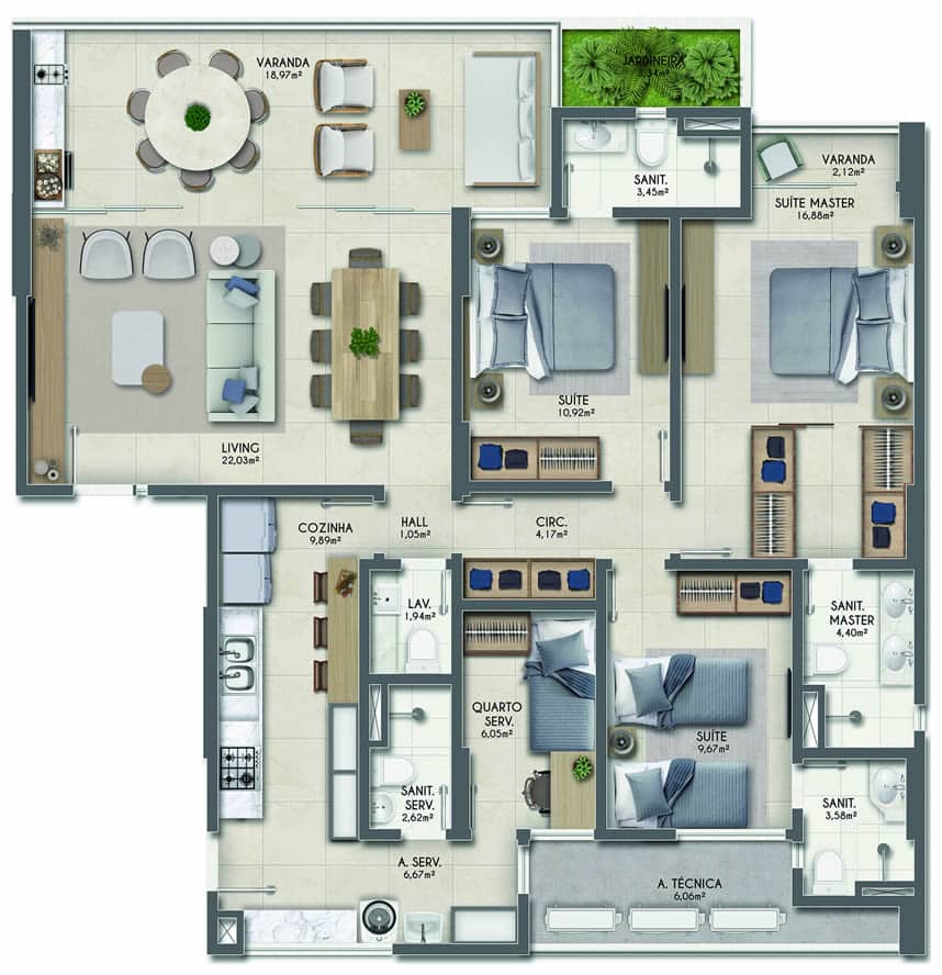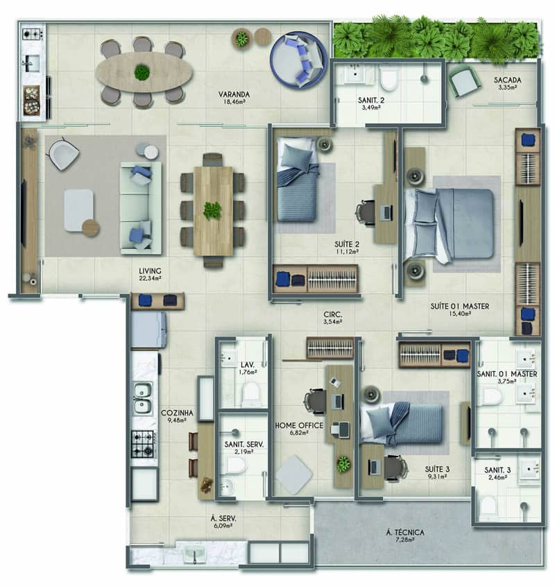 | 3 suítes com Home Office ou dependência e varanda Gourmet | 02 | 133,81 m² |