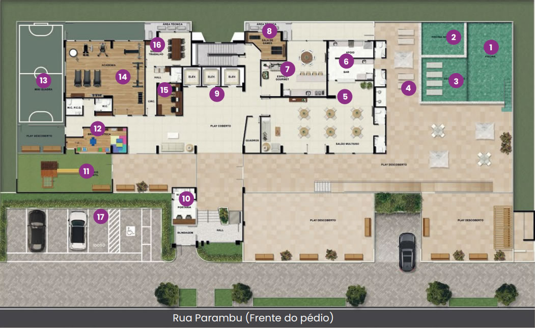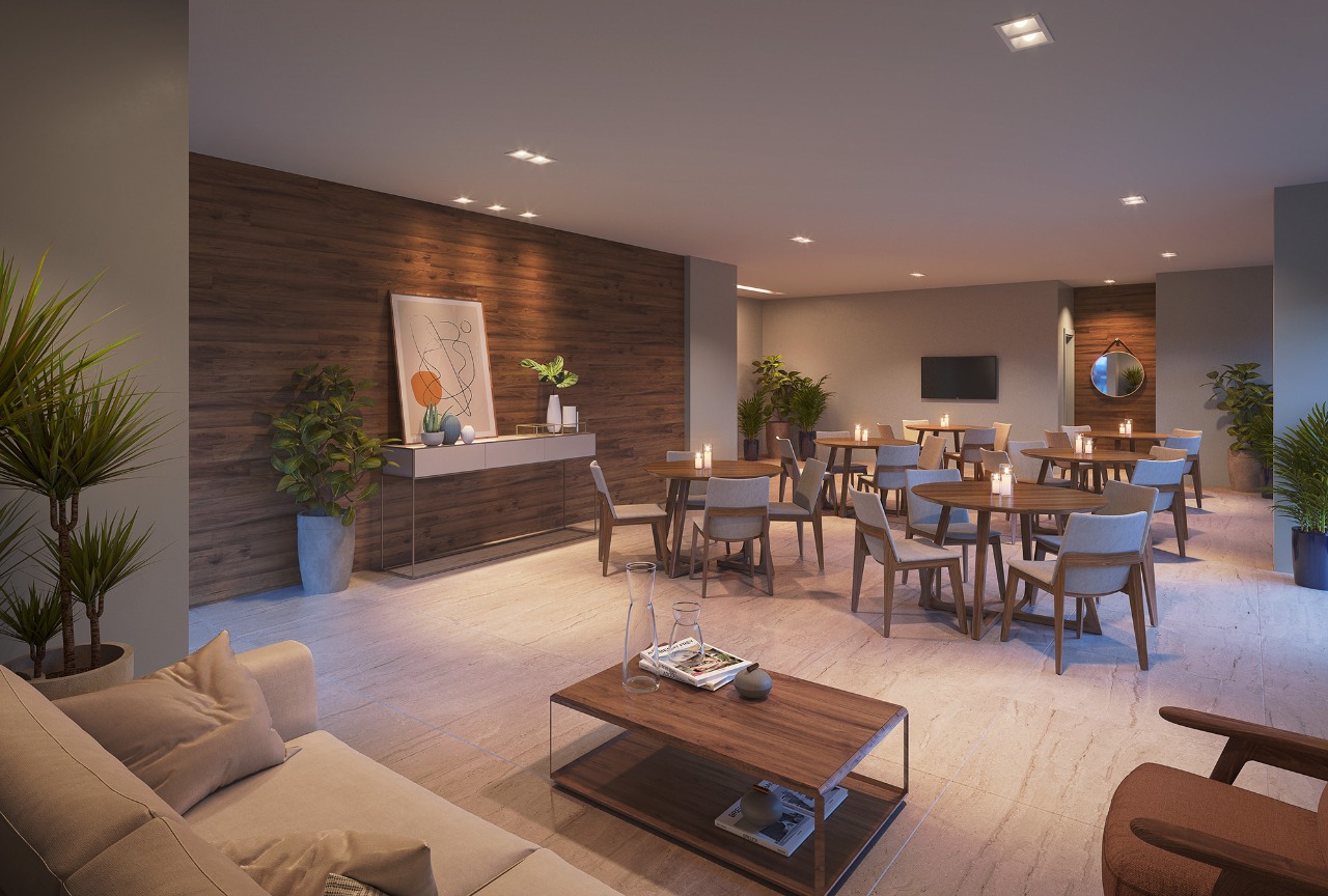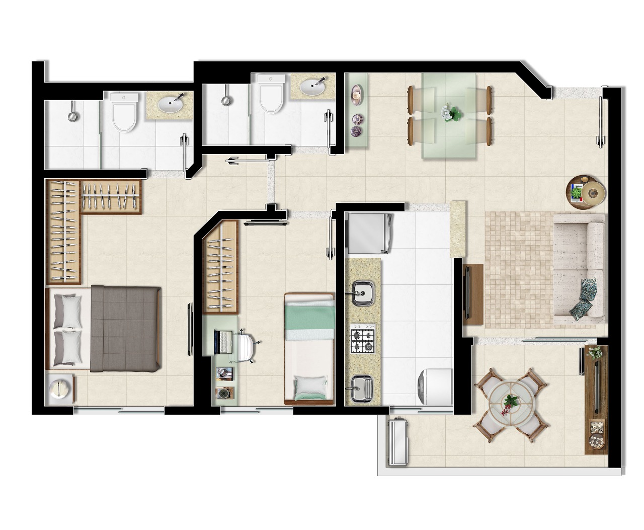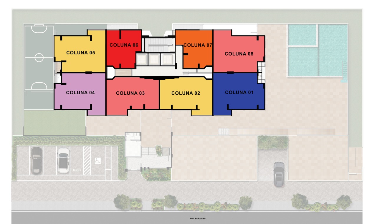 - Tipo 01 (colunas 01, 04, 05 e 08): 2/4 com suíte, closet e lavabo em 61m2 de área privativa;