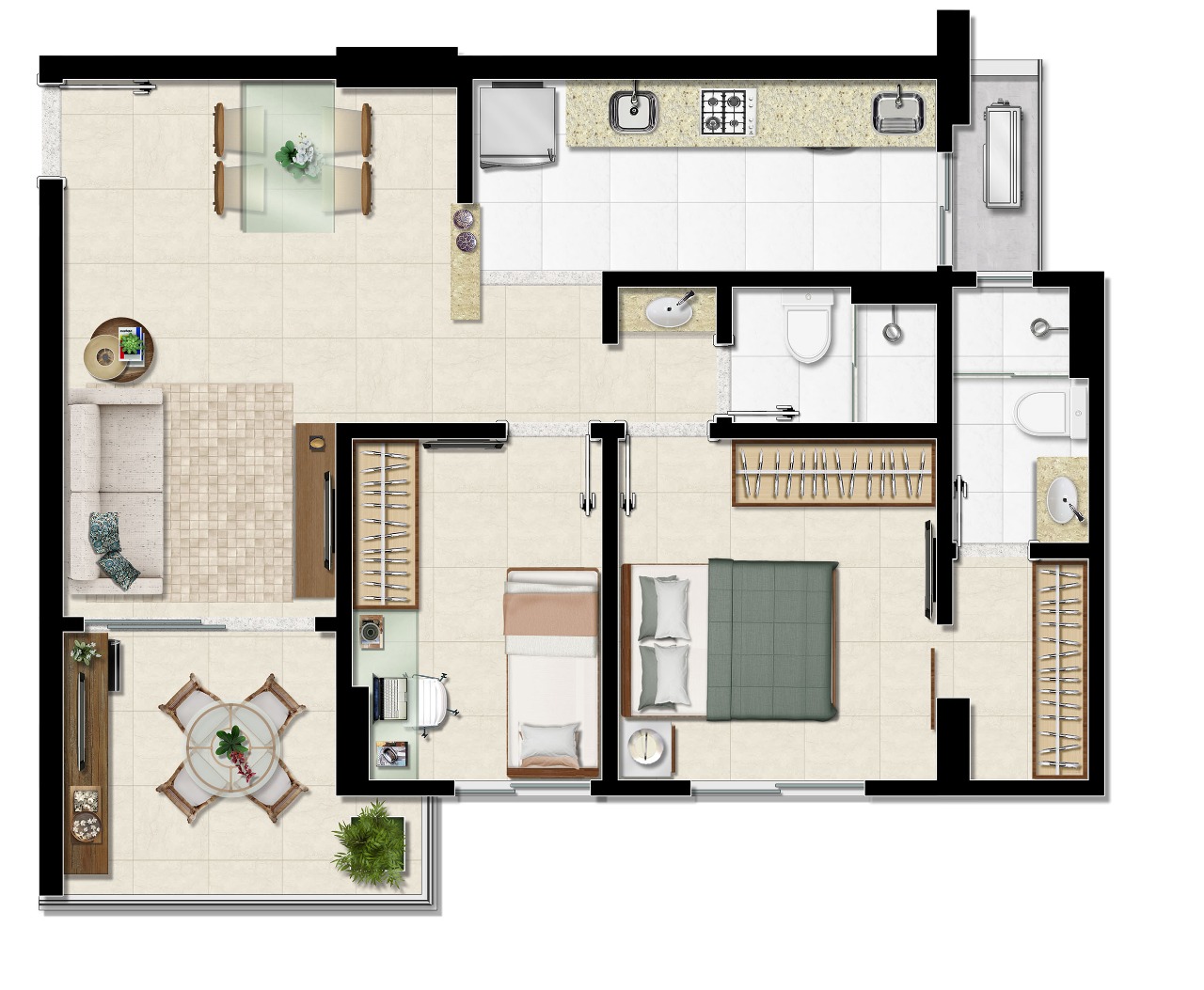 | Tipo 02: 2/4 com suíte e varanda | 2 | 1 | 01 ou 02 | 56 m² |