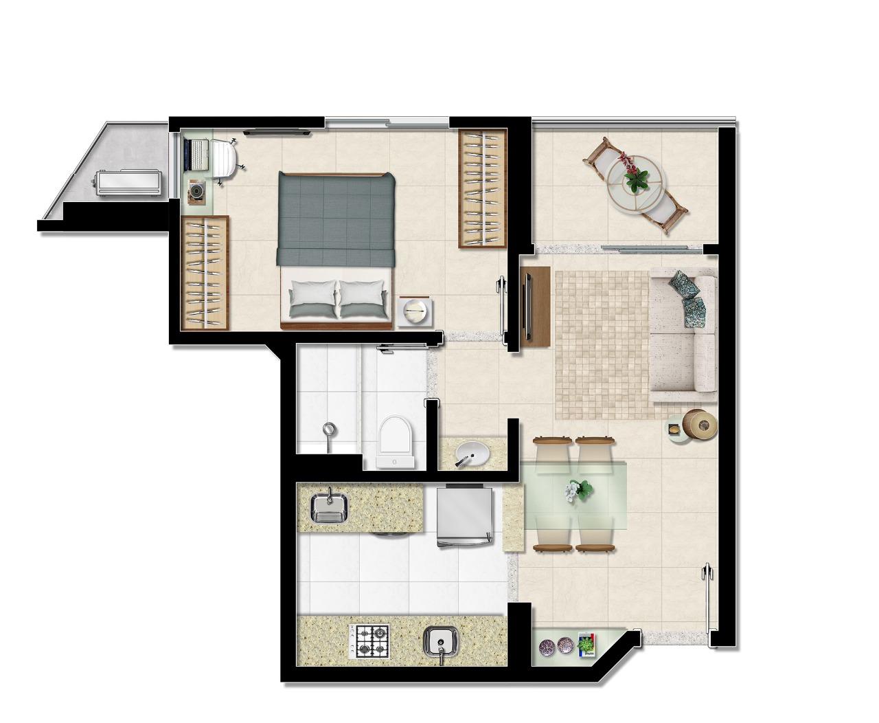 - Tipo 04 (colunas 07): 1/4, sala, varanda e lavabo com 40m2 de área privativa.
