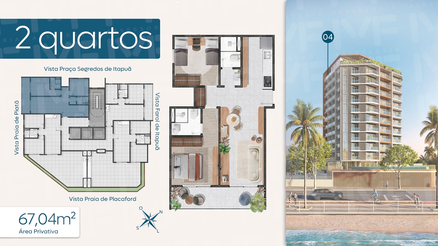 - Apartamentos de 2 quartos, com áreas de 70 m² e 1 vaga de garagem.