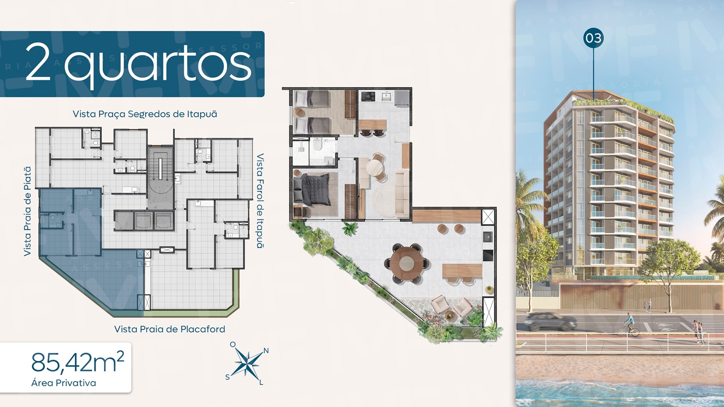 - Tipologias: Apartamentos de 2 e 3 quartos, com plantas entre 70 m² e 100 m².