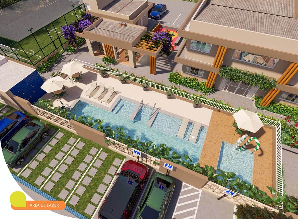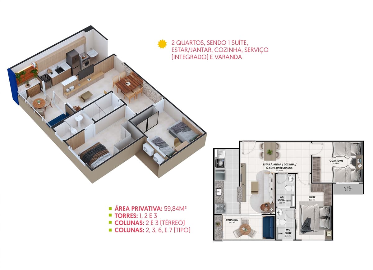 - Apartamento 2 Quartos – 59,84 m²: Compacto, mas bem planejado, com suíte e varanda. Ideal para casais e investidores.
