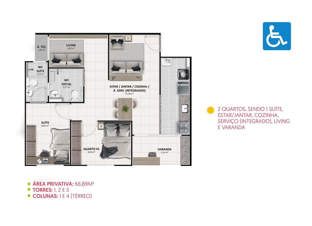 - Apartamento 2 Quartos – 66,89 m²: Com living e varanda, oferece conforto e acessibilidade em um projeto funcional.