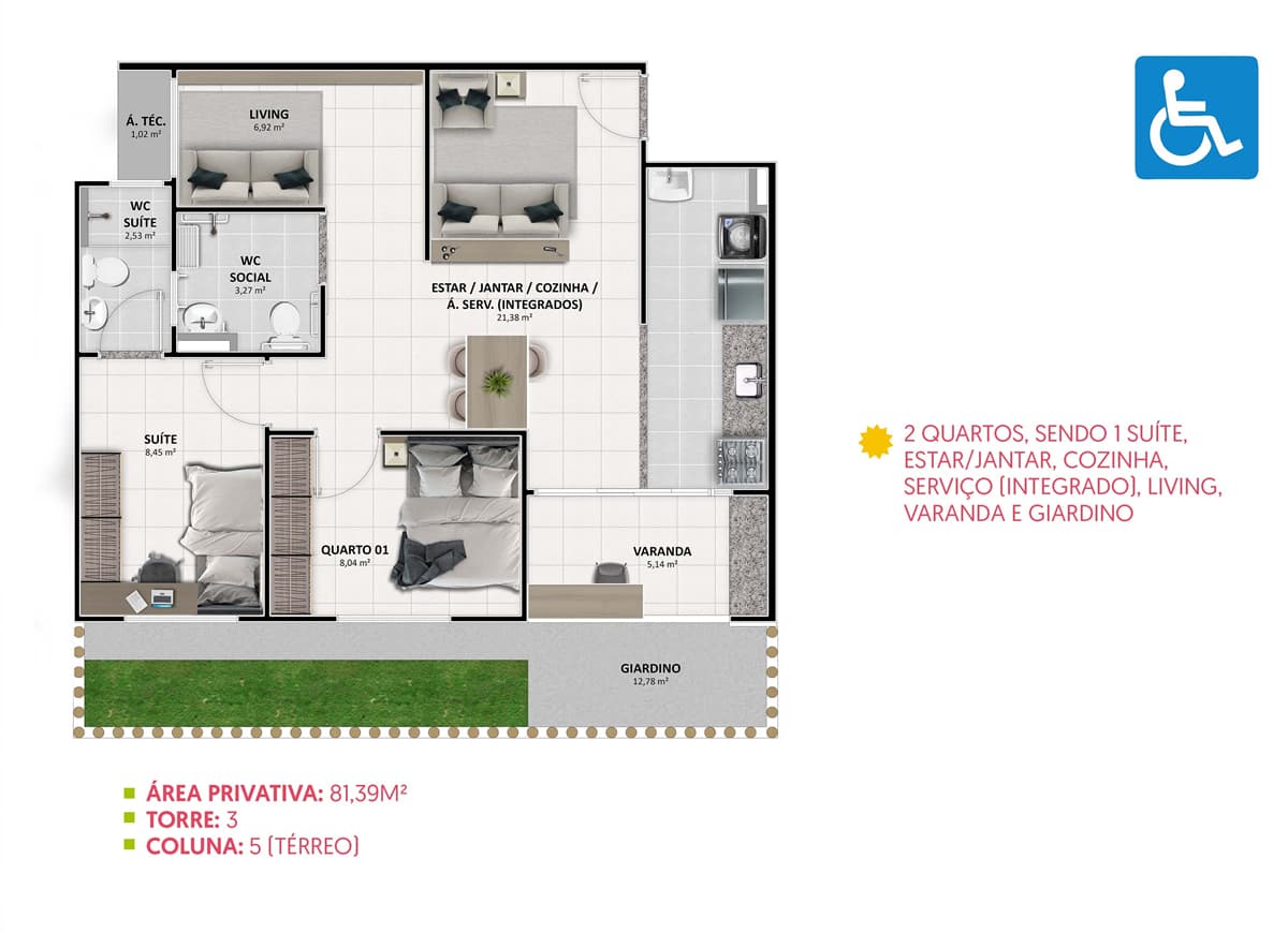 - Apartamento 2 Quartos – 81,39 m²: Unidade térrea com suíte, living, varanda e giardino. Ideal para quem busca mais espaço e acessibilidade.