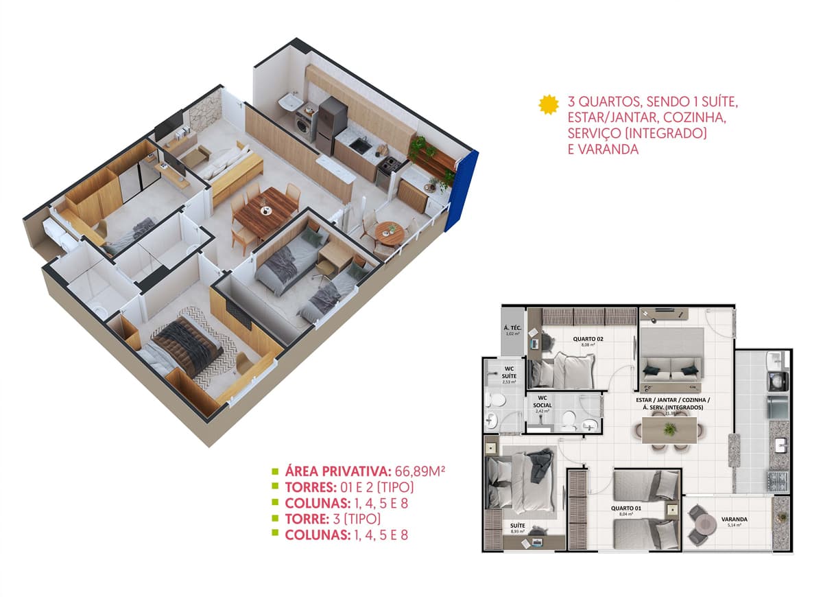 - Apartamento 3 Quartos – 66,89 m²: Layout inteligente com varanda, suíte e excelente aproveitamento da área privativa.