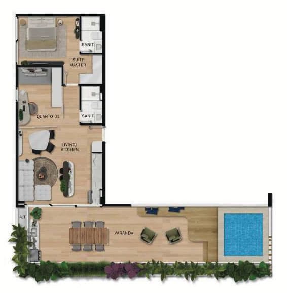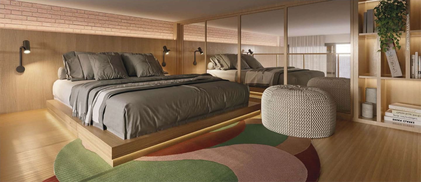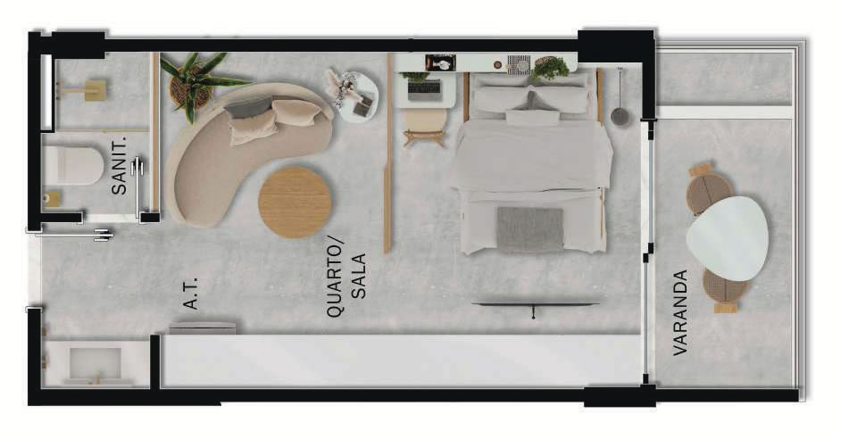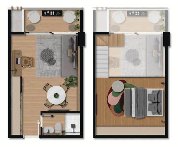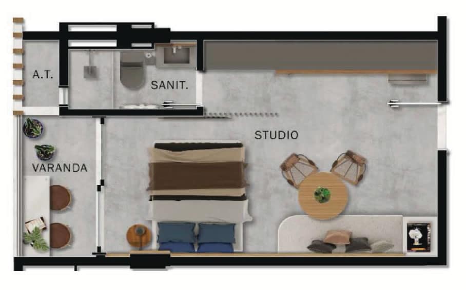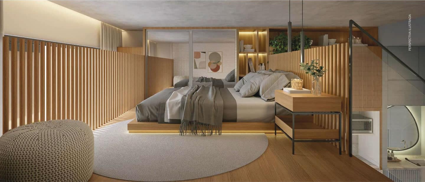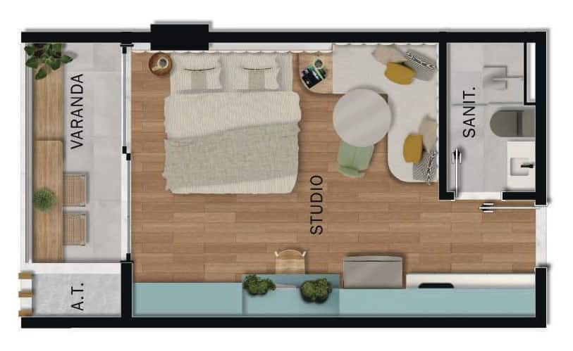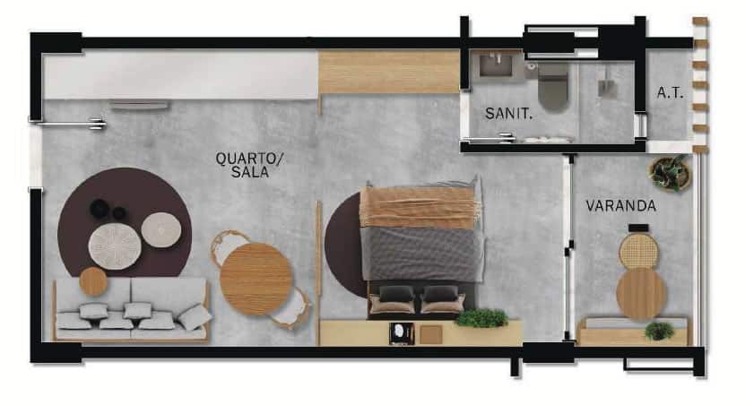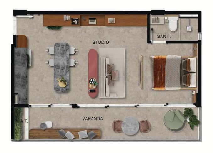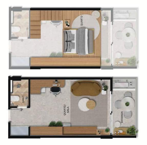 | Studio Sand Plus | Studio com mezanino, proporcionando um ambiente diferenciado e maior aproveitamento do espaço. | 27,32m² a 27,71m² |