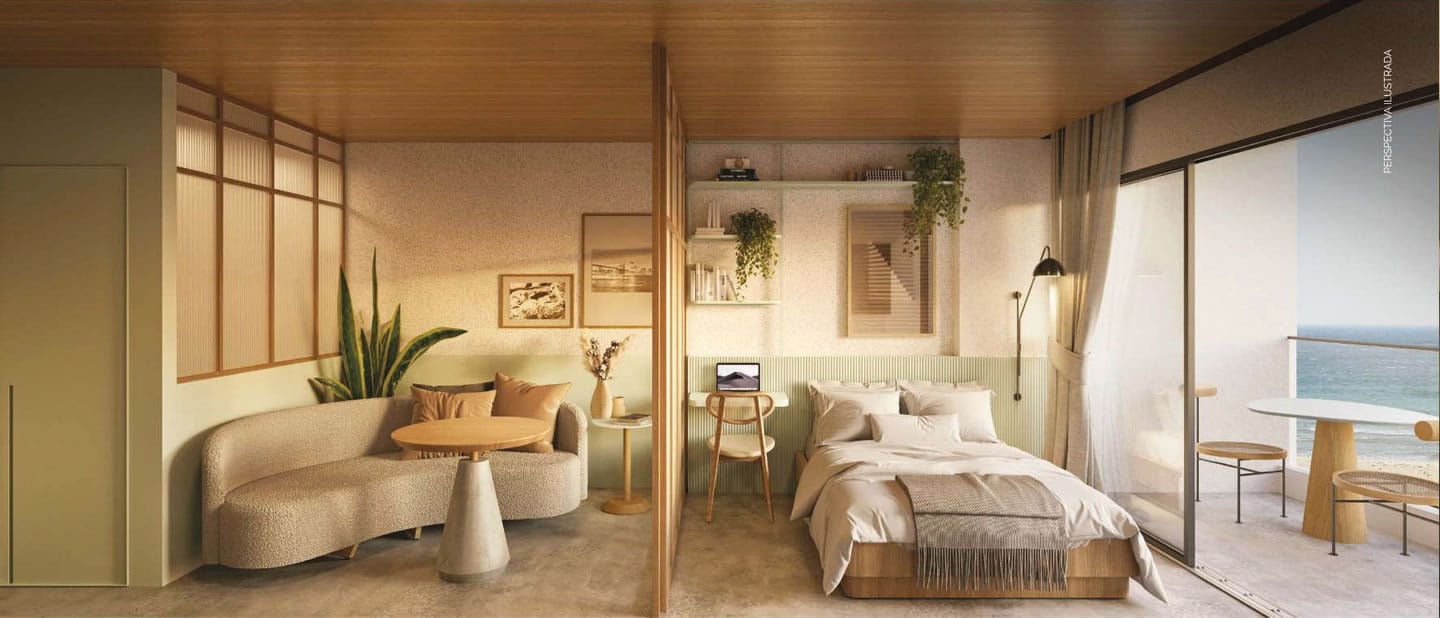 | Studio Float | Studio com vista lateral para o mar, sanitário com ventilação natural, perfeito para solteiros. | 22,28m² a 27,32m² |