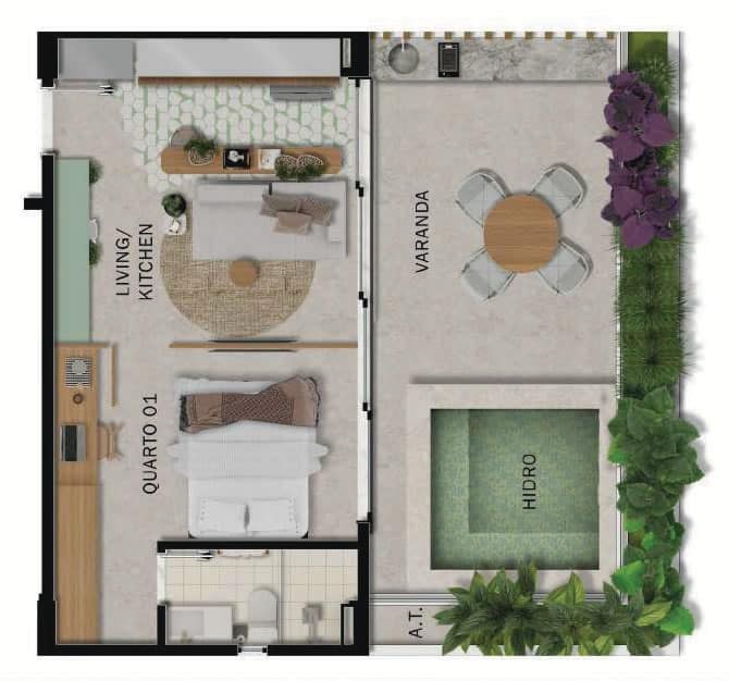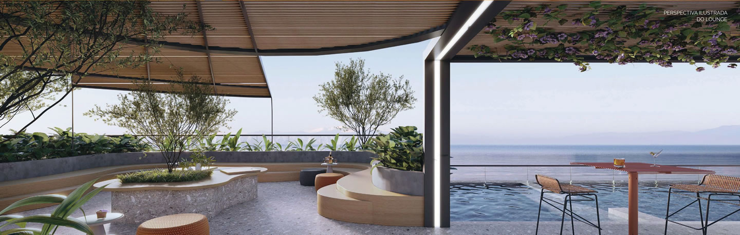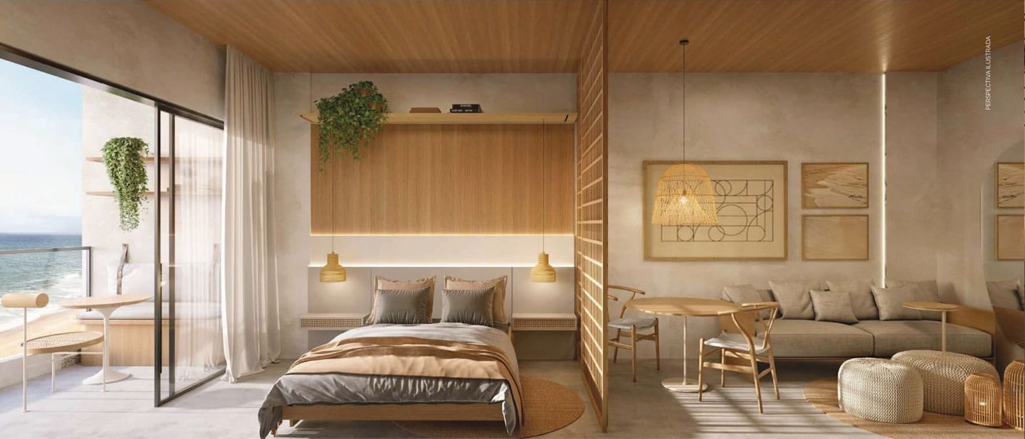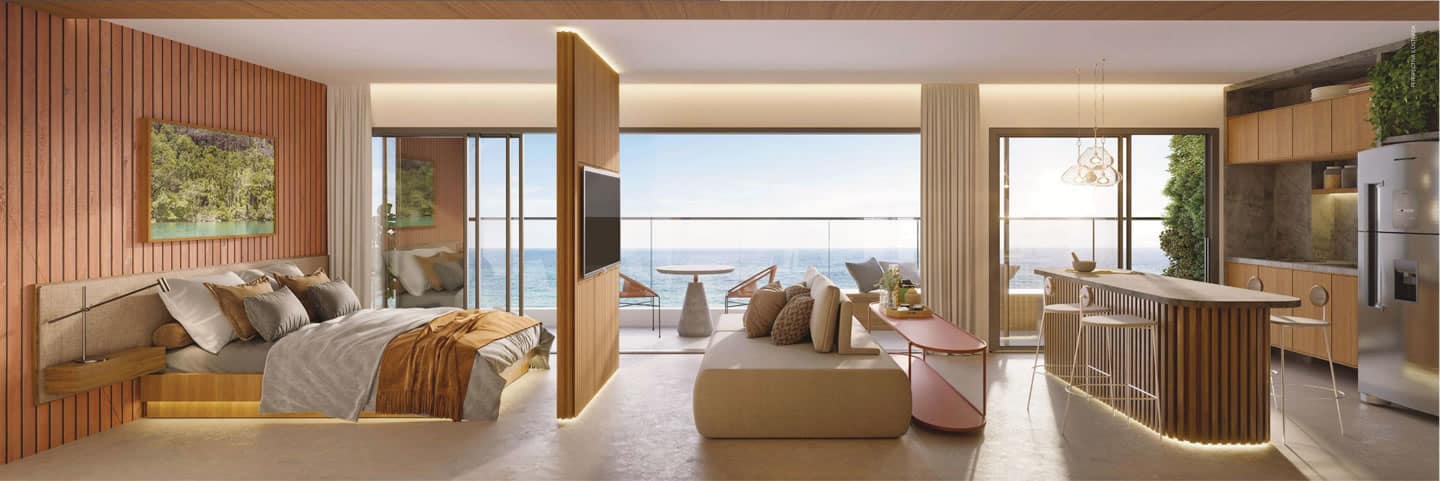 | Studio Wave | Studio de frente para o mar, com varanda ampla e sanitário com ventilação natural. | 37,32m² a 70,19m² |