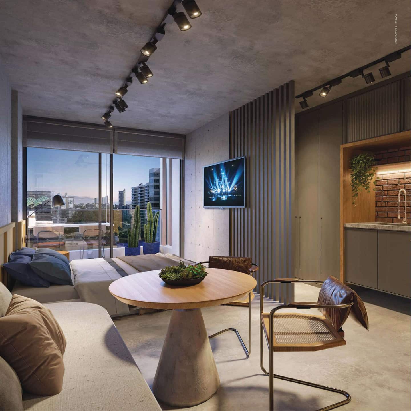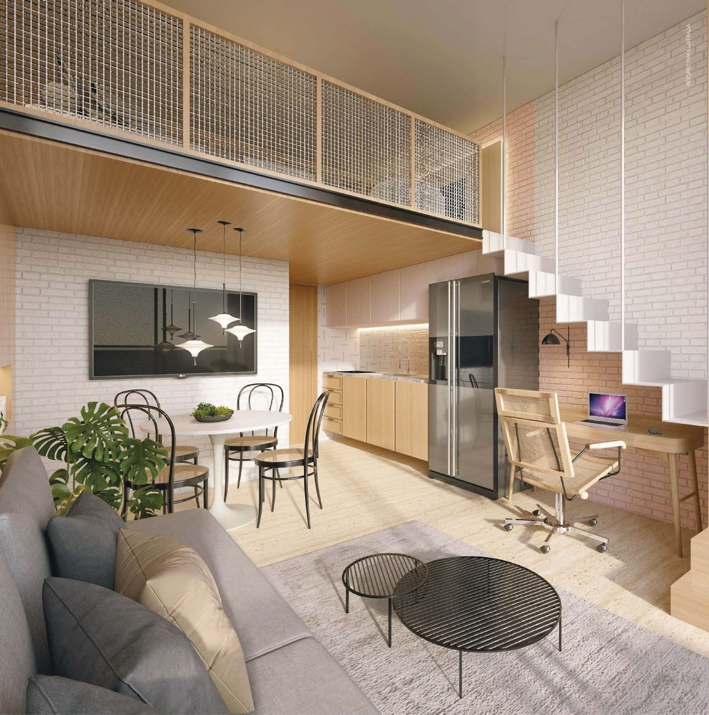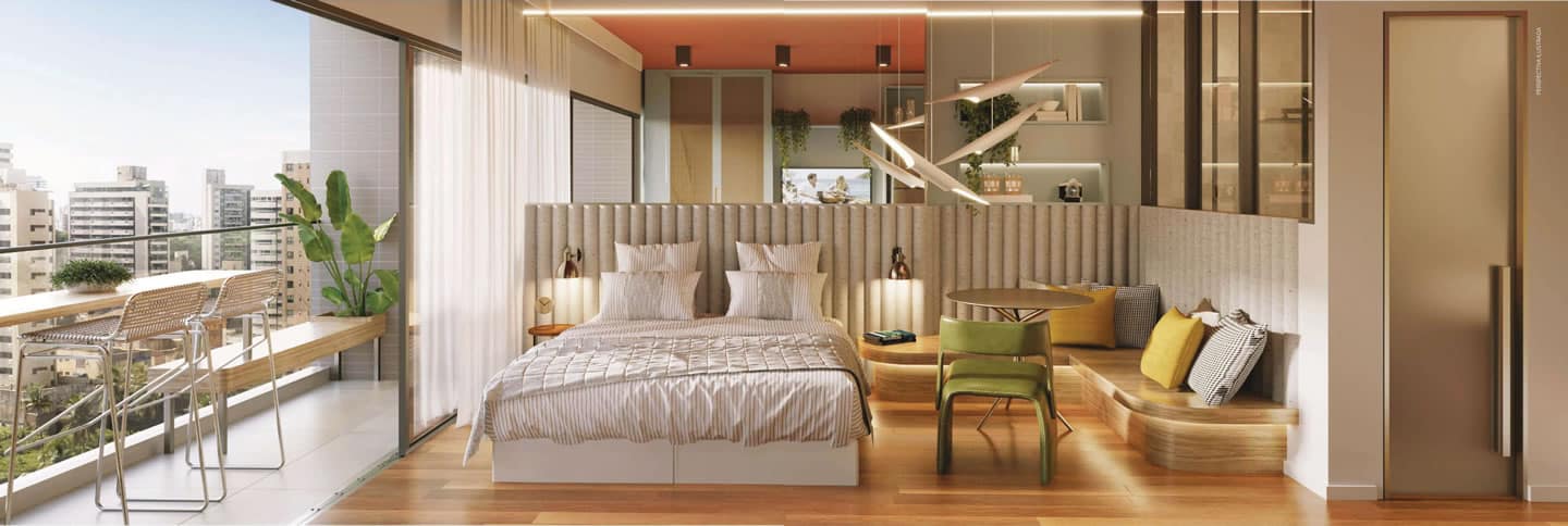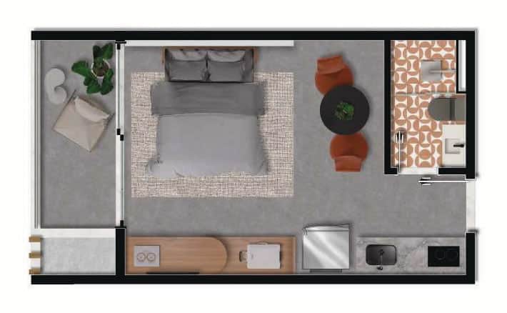 - Apartamentos de 1 quarto e sala ou studios com varanda, de 18,26m² a 35,24m².