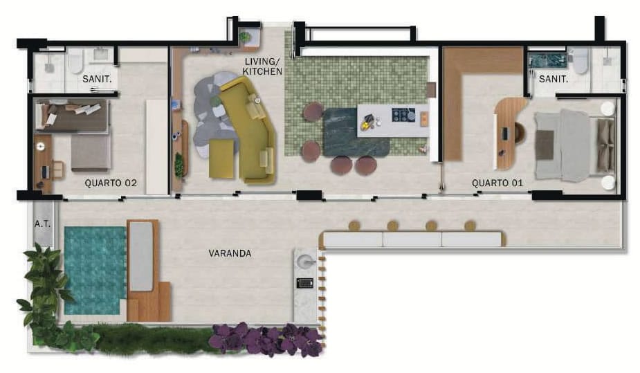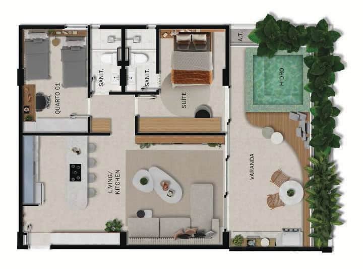 | Apê Salt One | Apartamento de 2 quartos com terraço, área gourmet privativa e spa. Inclui suíte e sanitário social. | 110,73m² |
