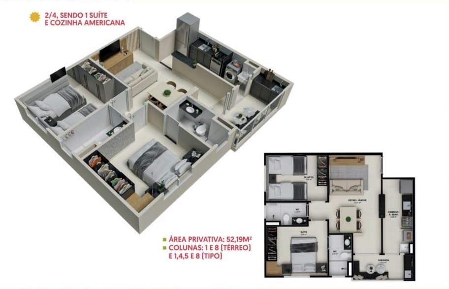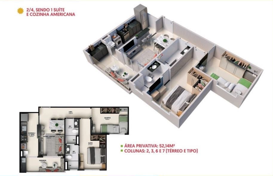 Área: 52,14 m² | 2 quartos (1 suíte)